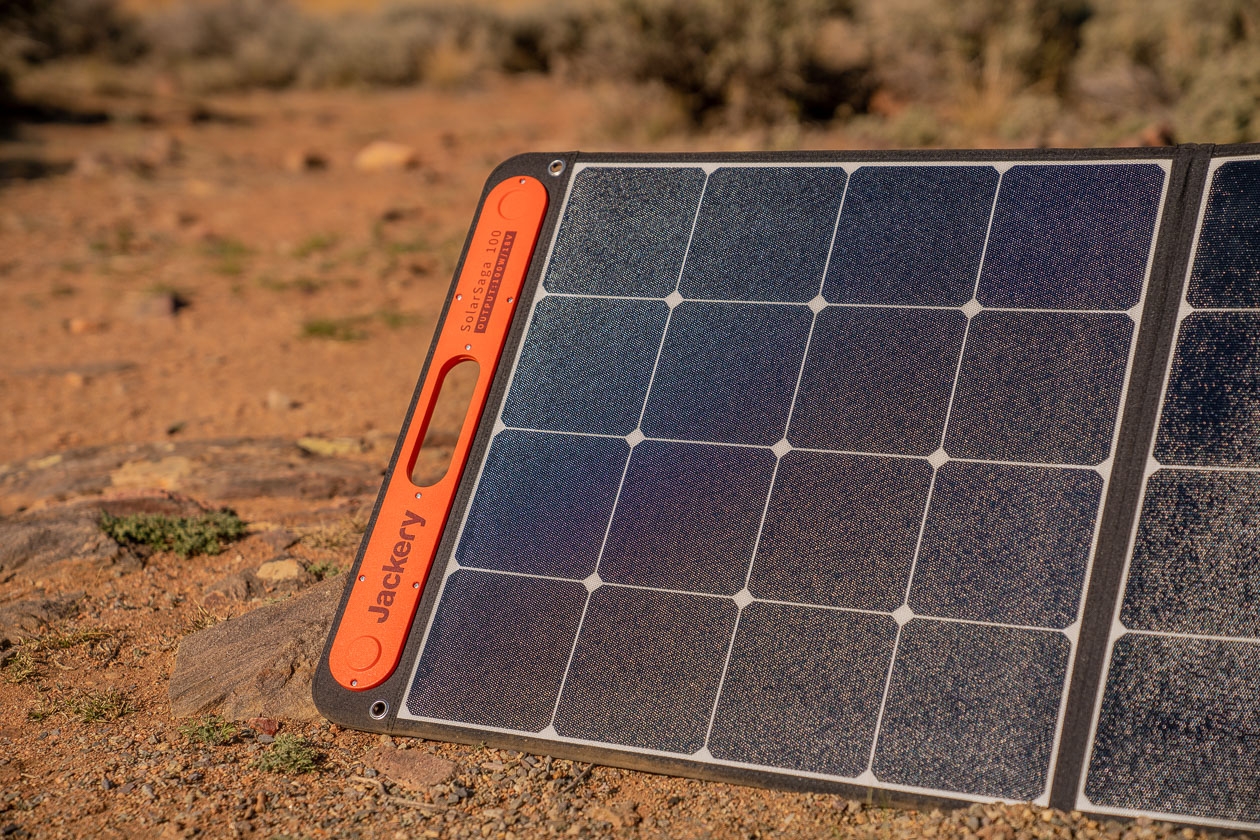 - Jackery SolarSaga 100W: ofrece mayor potencia y versatilidad. Con menos de 5 kg de peso y un formato plegable que facilita el transporte, este panel es ideal para quienes necesitan alimentar estaciones de energía más grandes, laptops o pequeños electrodomésticos durante viajes prolongados o cortes de luz. Su voltaje de salida de 20 V y corriente de hasta 5 A le permiten cargar equipos de manera rápida y estable. Además, incorpora salidas USB-A y USB-C, lo que brinda la opción de cargar dispositivos directamente, al mismo tiempo que se conecta a una estación Jackery.