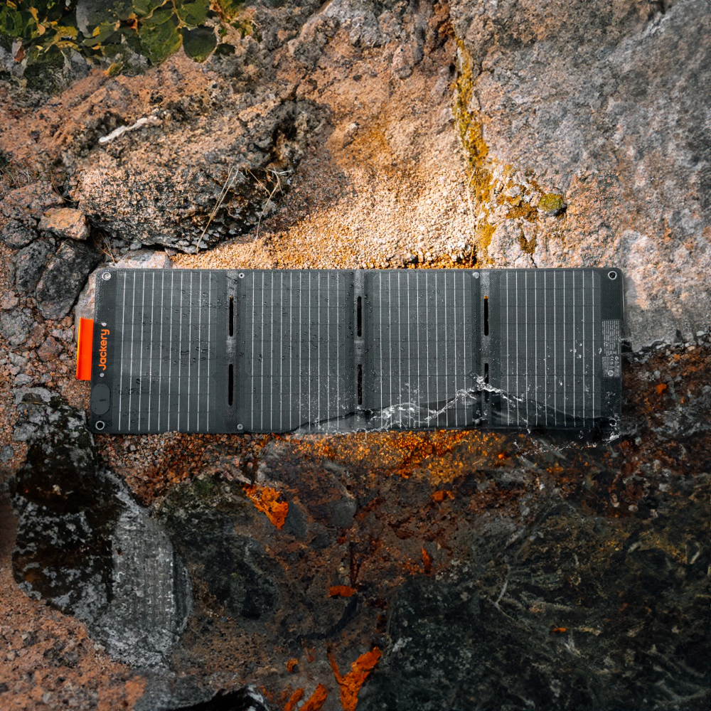 - Jackery SolarSaga 40 Mini: es el panel más liviano y compacto de la línea, con apenas 1,2 kg de peso y un diseño plegable en cuatro secciones que entra fácilmente en una mochila. Gracias a sus puertos USB-A y USB-C integrados, permite cargar directamente dispositivos como celulares, tablets o cámaras, sin necesidad de una estación intermedia. En condiciones óptimas, también puede alimentar modelos portátiles como la Explorer 300 Plus. Es perfecto para salidas de un día, excursiones escolares o actividades al aire libre donde la ligereza y practicidad son clave.